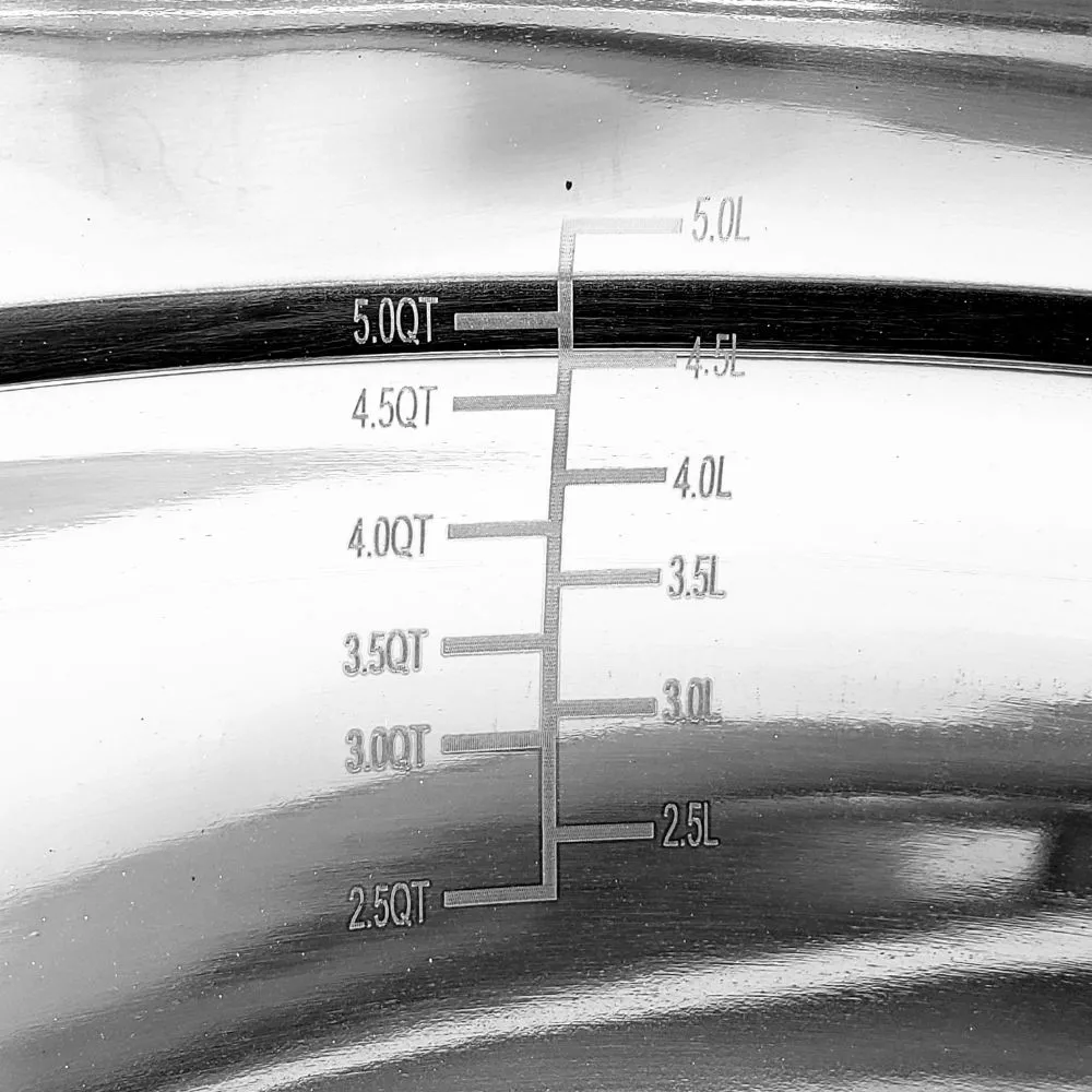 Para se ter noção de volume, as tigelas possuem marcações em litros. A tigela de 30cm tem a capacidade máxima de aproximadamente 6,1L e suas marcações internas são de 2,5L, 3,0L, 3,5L, 4,0L, 4,5L e 5,0L.