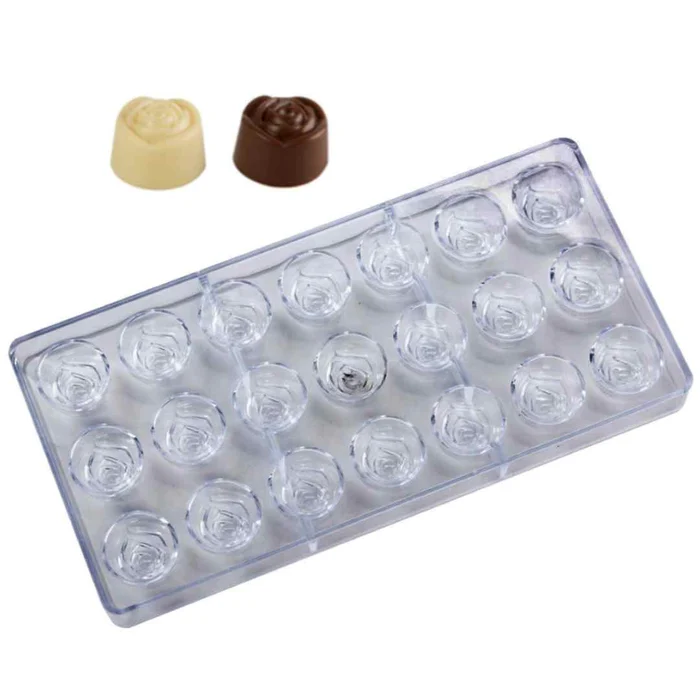 A Forma para Chocolate em Poliestireno Rosas faz belíssimos bombons de chocolate com um desenho romântico e delicado, possibilitando infinitas decorações.