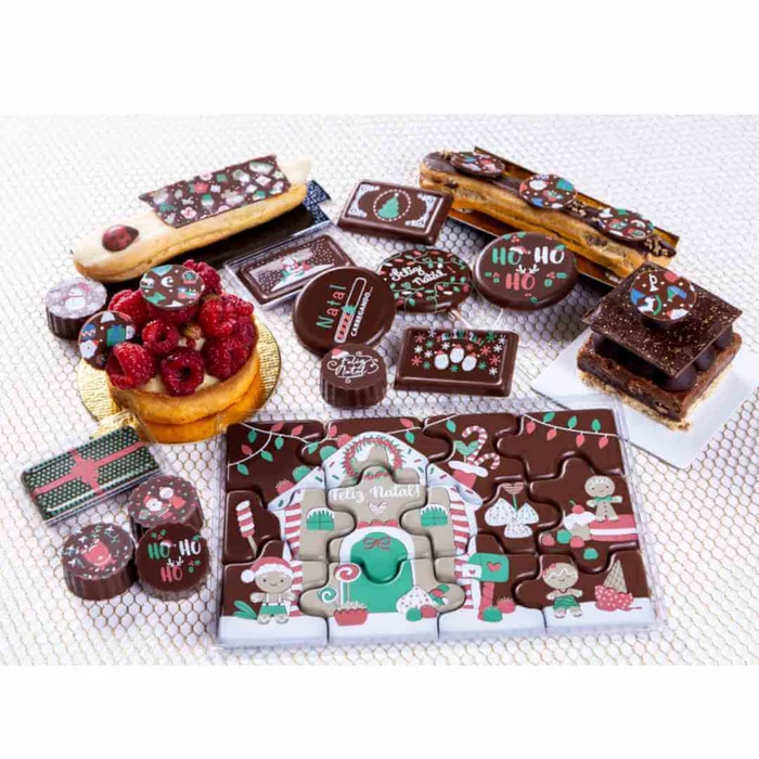 Com este modelo de mini tablete/barra você faz 13 tabletes com 4 desenhos no tema de Feliz Natal para o Natal que podem ser colocados em caixinhas transparentes de acetato que acompanham a forma decorativa.