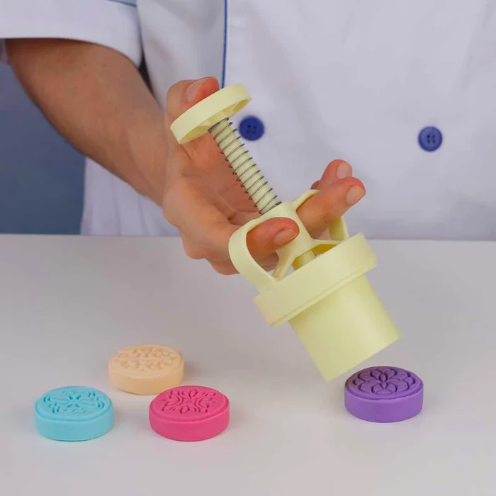 Para usar o kit é simples! Primeiro escolha o desenho que você quer que o seu doce ou a sua massa tenha e encaixe no embolo. O encaixe é fácil e sem mistério, é só encaixar e girar para que ele fique travado. Então, porcione a massa com a quantidade desejada e coloque dentro do ejetor, para então pressionar sobre a sua superfície de trabalho, fazendo com que além de modelar no formato do ejetor a massa ganhe o desenho escolhido.