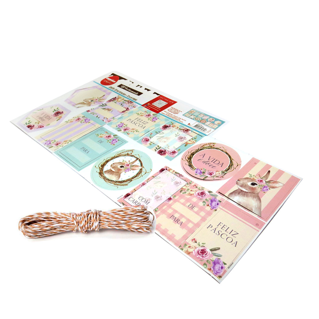 O modelo Coelha Serena traz um ar romântico e delicado com 13 tags de DE/PARA em diversos formatos e desenhos, além de contar com 13 metros de cordão de papel kraft branco e pardo para deixar tudo bem amarradinho em suas embalagens.